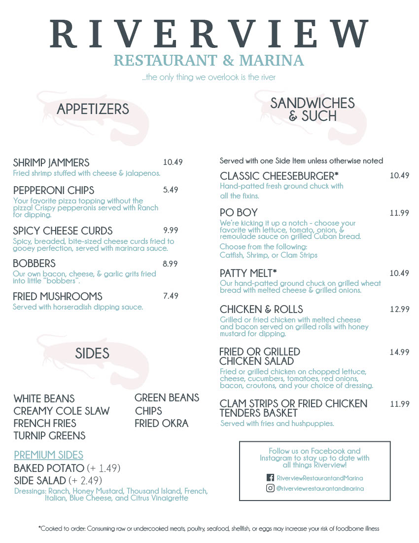 Affordably priced, Riverview Restaurant & Marina invites you to indulge your cravings while enjoying the charm of its riverside locale. With every visit, you're assured of delightful meals and the warm smiles of a dedicated staff who strive to make your dining experience exceptional. Join us at Riverview, where great food and breathtaking views come together for a truly unique experience!