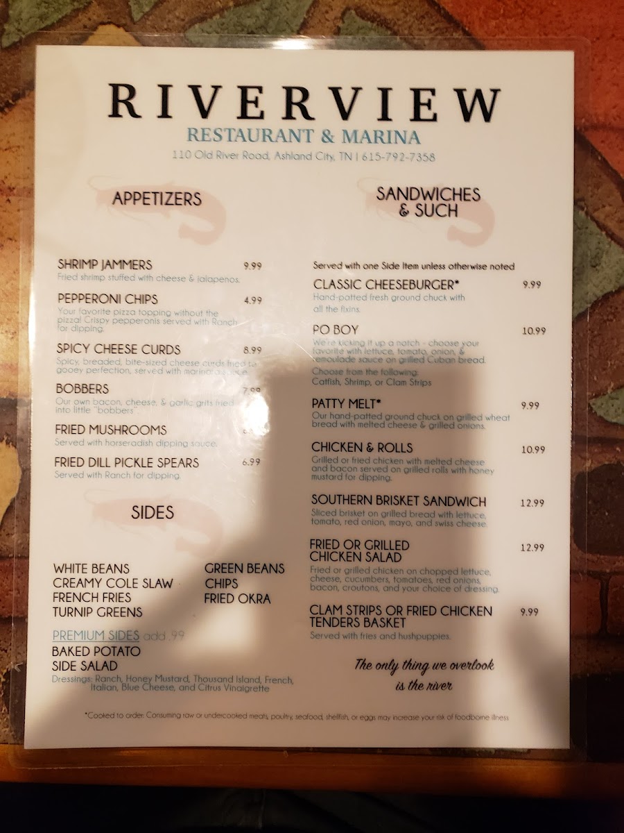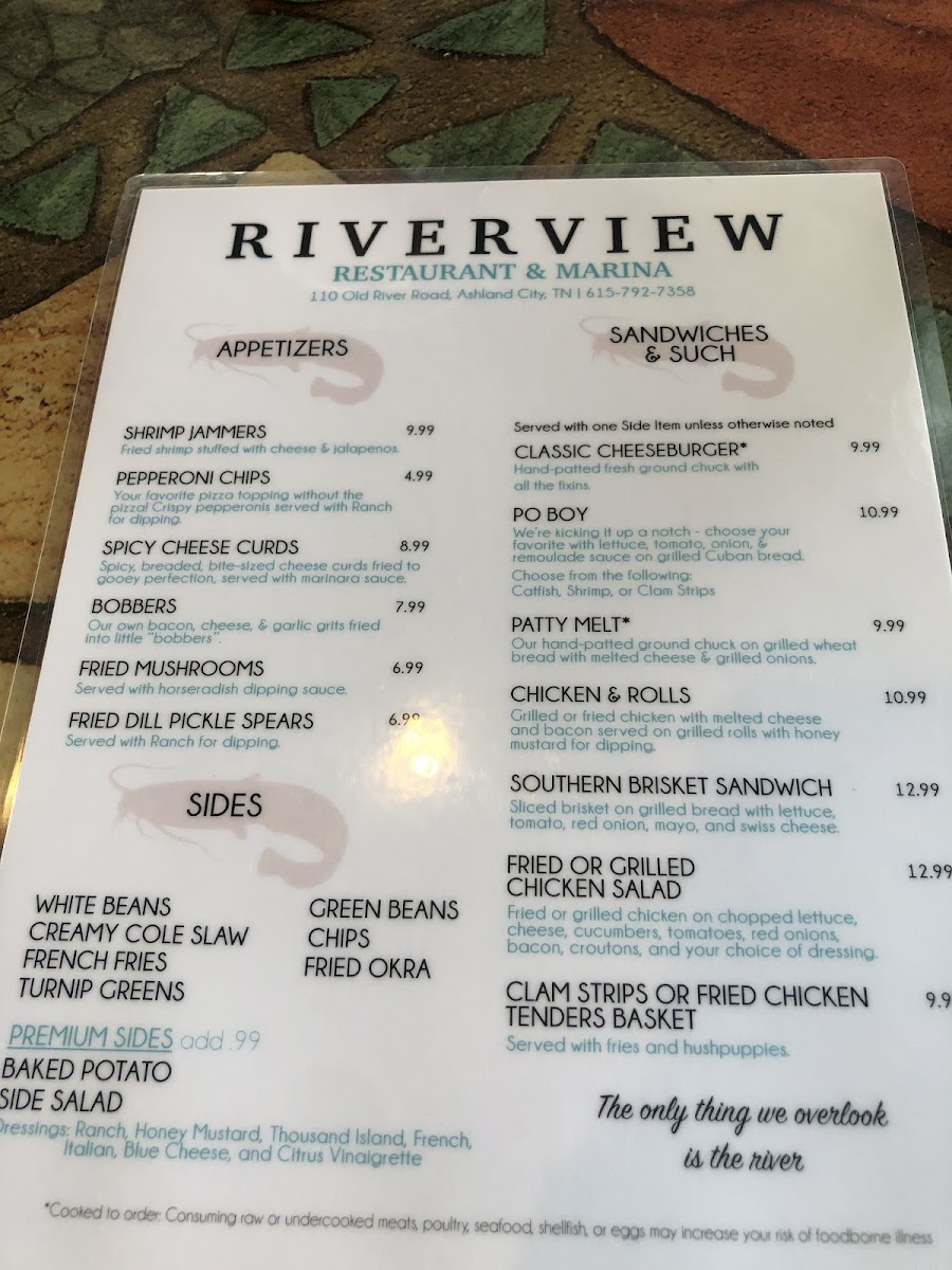 Welcome to Riverview Restaurant & Marina, a hidden gem located on Old River Road in Ashland City, TN. This delightful eatery offers an unforgettable dining experience, boasting stunning views of the river. Guests rave about the excellent catfish, shrimp, and mouthwatering hushpuppies, complemented by attentive and friendly service. Families appreciate the accommodating atmosphere and reasonable prices, making it an ideal spot for gatherings. Whether you're celebrating a special event or simply enjoying a meal with loved ones, Riverview’s charm and delicious offerings ensure you leave with a smile. Come and indulge in a memorable culinary journey by the water!